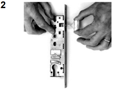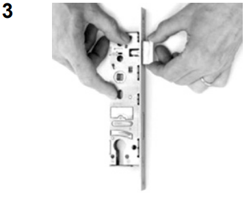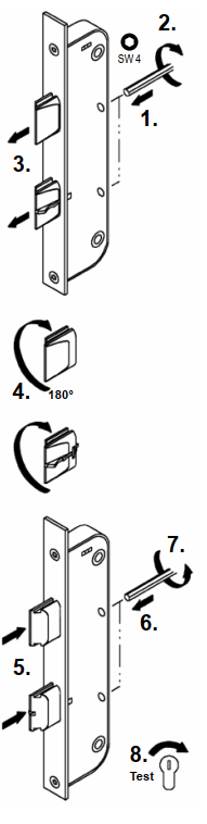 2. Die Falle in die gewünschte Richtung drehen und wieder in das Schloss eindrücken. Dabei muss ein deutlicher Druckpunkt überwunden werden. Beim Einrasten der Haltefeder ist ein deutliches Klicken zu hören. Nach der Umstellung, die Falle auf Funktion und festen Sitz kontrollieren.