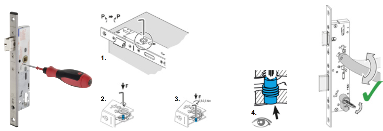 Hierzu Fallenriegel durch Betätigung des Auslösehebels in Riegelposition bringen, anschließend Siegeletikett an markierter Stelle mit Drehmomentschlüssel durchstoßen und Panikstift bis zum Anschlag drehen. Abschließend Panikfunktion unbedingt auf einwandfreie Funktion prüfen!