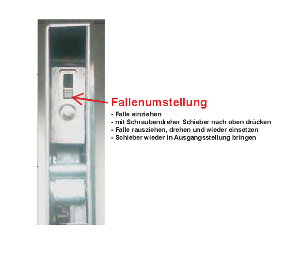 ACHTUNG: Bei Schlössern mit der Antipanikfunktion B, C und D muss nicht nur die Falle, sondern auch noch die Panikfunktion umgelegt werden.