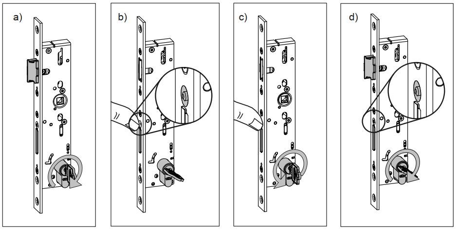 Feststellung erzeugen Falle mit Türdrücker zurückziehen oder von Hand zurückdrücken und durch Drehbewegung des Schlüssels in Verschlussrichtung festsetzen.
