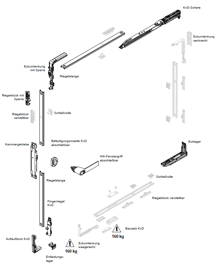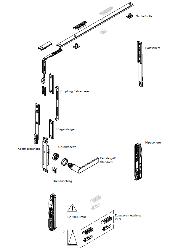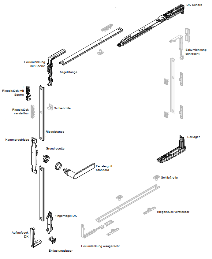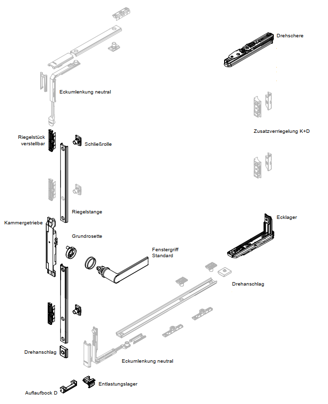 Das Aussehen und die Einbaulage der jeweiligen Teile im Fenster können mithilfe der folgenden Abbildung für die jeweilige Öffnungsart bestimmt werden: